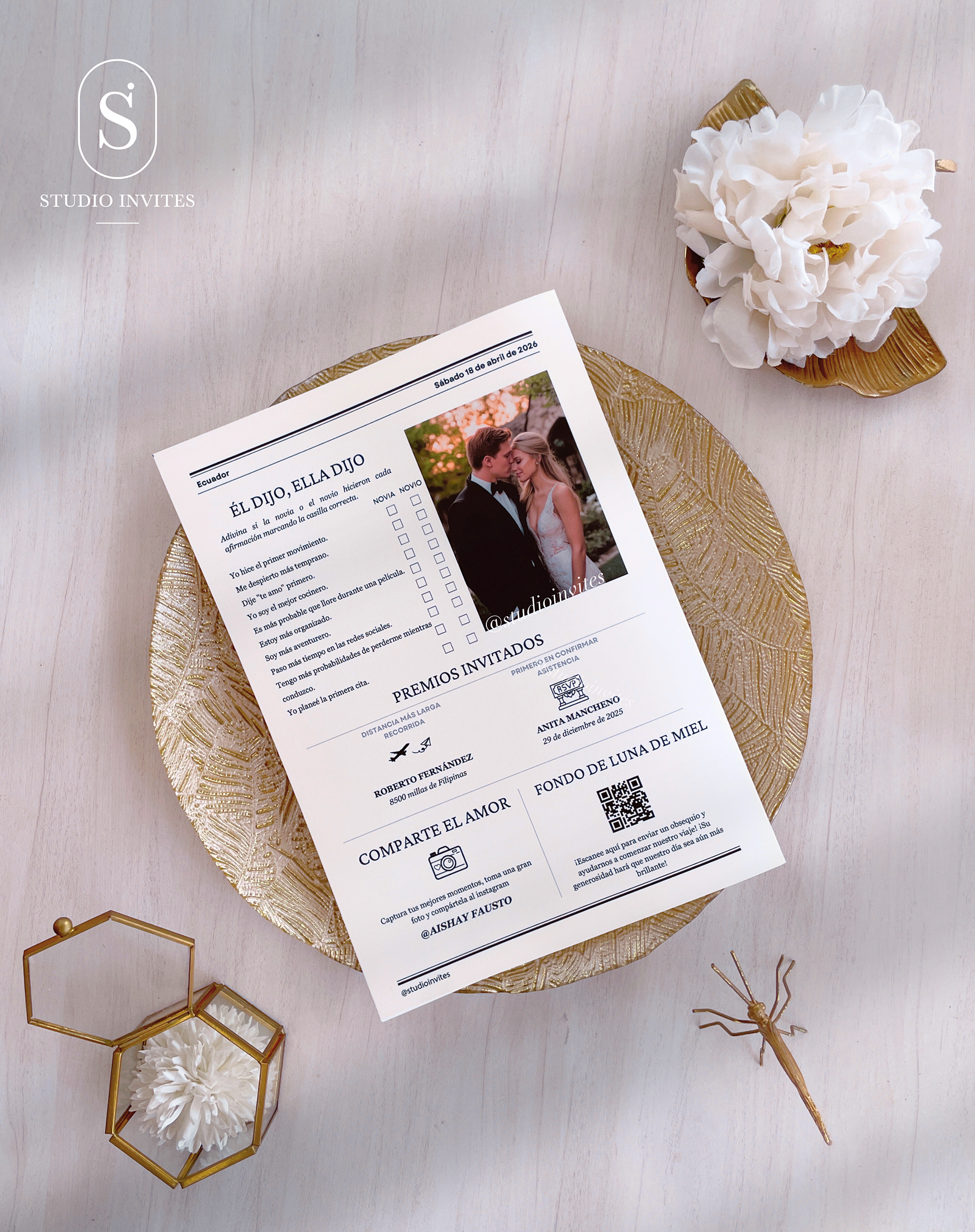 Tiempo de edición de Diseño predeterminado de periódico para bodas. el cliente proporciona la información en texto editable y fotos en alta resolución. No incluye retoque fotográfico. Los diseños son exclusivos de Studio Invites, no se entregan archivos ditable a los clientes. Puede elegir la opción de impresión desde 12 periódicos en adelante. La impresión es en cartulina clara mate de acuerdo a stock en tamaño A3.